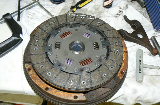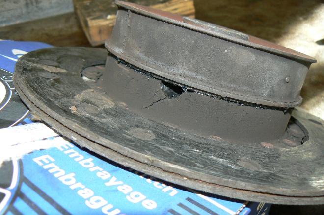 | Here's a picture of the original and replacement clutch disks. You can clearly see where the old rubber center clutch disc separated, probably during the initial big bang. I got a couple of days out of it with the second trans installed before it went into full spin mode. When it went completely I originally diagnosed it as a bad used trans and started shopping for another. |